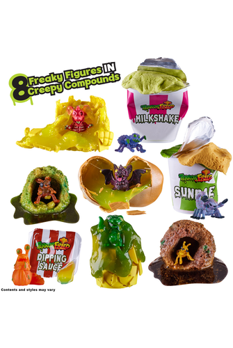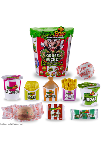 Discover the nastiest, freakiest figures from deep inside the fast-food fryer! Each Terror Fried meal includes creepy compounds, allowing you to fizz, squish, crack, and ooze as you play through multiple layers of discovery and gross out reveals - it's Terror Frying! Get more than you bargained for with the Terror Fried Gross Bucket. Fizz, squish, crack and ooze the creepy critters hiding inside each snack. The nugget and burger 'fry' in water to reveal a freaky figure. Smash open the crackle fries, corn and chicken leg, and then squish the foul flurry and mouldy milkshake to find each character - the Gross Bucket has 9 compounds with 8 creepy collectible figures inside! Find and collect over 30 Terror Fried figures (each sold separately), including rare neon and super-rare metallic figures! Includes collector's sheet to track your Terror Fried creature collection. Contains: 8 Figures, 1 Collector Sheet, 1 Fizz-bomb Burger, 1 Fizz-bomb Nugget, 1 Crackle Fries, 1 Crackle Chicken, 1 Crackle Corn, 1 Mouldy Milkshake, 1 Foul Flurry, 1 Slime Sauce Dip, 1 Sachet Smelly Sauce