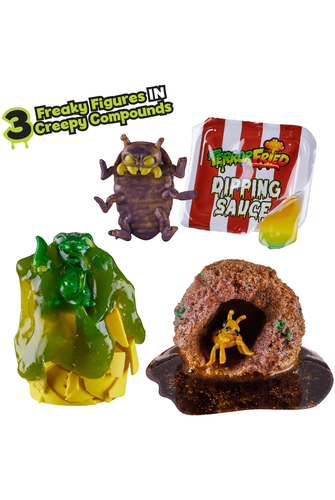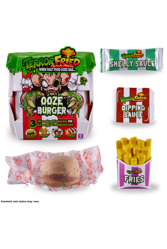 Discover the nastiest, freakiest figures from deep inside the fast-food fryer! Each Terror Fried meal includes creepy compounds, allowing you to fizz, squish, crack, and ooze as you play through multiple layers of discovery and gross out reveals - it's Terror Frying! Open up the classic burger & fries - Terror Fried style! The Terror Fried Ooze Burger meal box includes a fizz-bomb burger and crackle fries. Drop the burger into water for a fizz-fry reveal. Then, crush open the fries and peel open the dipping sauces for more horrible surprises! The Terror Fried Ooze Burger comes in fast-food style carton and includes a collector sheet. Unpack 4 different compounds (burger, fries and two types of slime) to discover 3 freaky figures.