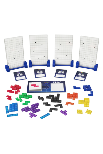 Play Tetris in real life and go head-to-head against your friends in this competitive family game of dropping, blocking and scoring. Just like in the classic digital game, compete to complete lines by rotating and dropping Tetriminos into your grid. But there's a twist: gain the power to drop "garbage" pieces into an opponent's grid, blocking their path to victory. Bring the fun of the classic digital game to the tabletop & experience the fun of Tetris in real life with this multiplayer strategy game of rotating, dropping & line making. Drop a Tetrimino on a black Garbage Drop Icon in your grid to gain the power to add a piece to an opponent's grid to block their line & their path to victory. Tetris fans of all ages will have a blast dropping the semi-translucent pieces straight from the video game while having fun strategizing & problem solving. For 2-4 players, ages 8 & up.