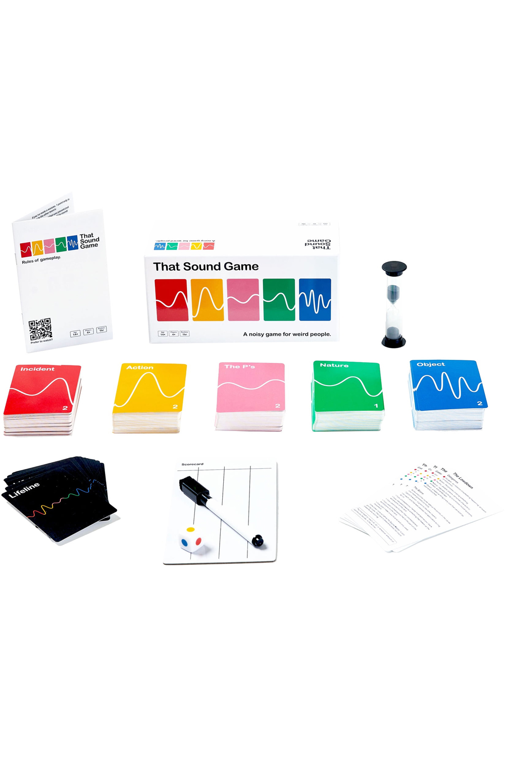 That Sound Game is a fast paced, interactive, and very noisy party game. The goal is to get your team to guess as many answers on the category cards as they can in a minute. Use any combination of sounds and movements, but your hands must be behind your back. You also get Lifelines. Use them strategically to help you win. The Sound Game is sure to be a hit for game night or parties with friends.