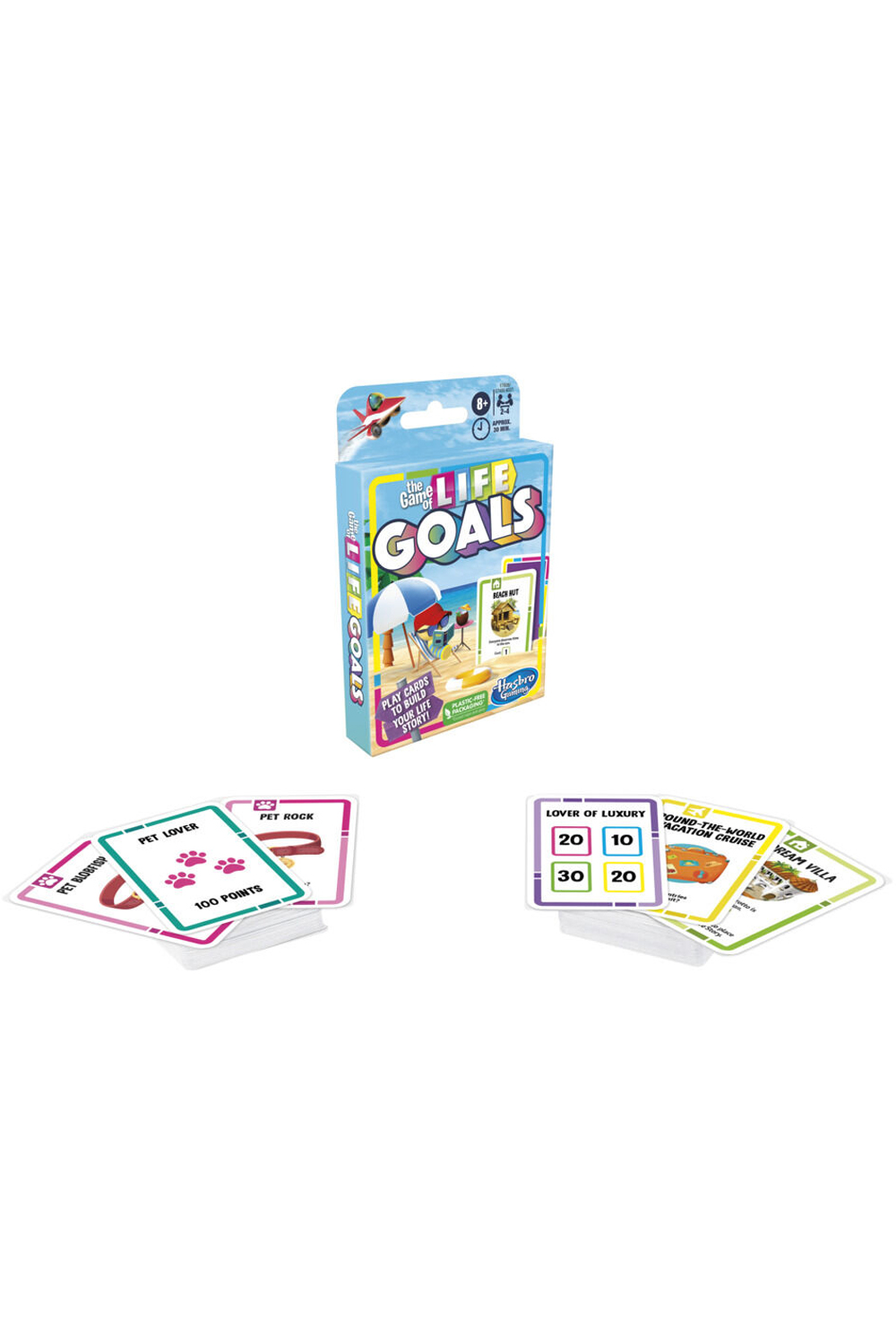 Get ready for the exciting, quick-playing The Game of Life Goals card game! While players can't control the cards they're dealt, they can choose what to do with them! First, each player will be dealt a Lifestyle card, which reveals their personality for the game - and how to tally points at the end of it. For example, have the "Thrillseeker" Lifestyle card? Then Adventure cards will be worth the most points at the end of the game, but House cards won't. Players build their Life Story with Choice cards that fill it with fun experiences, and they try to clinch Life Goals to rack up points faster. To win, score the most points by achieving Life Goals, staying true to the Lifestyle card, and living life to the fullest! Easy to set up, this Game of Life card game for ages 8 and up is a great family game for game nights and parties. It's also a fun travel game for plane rides or vacations.