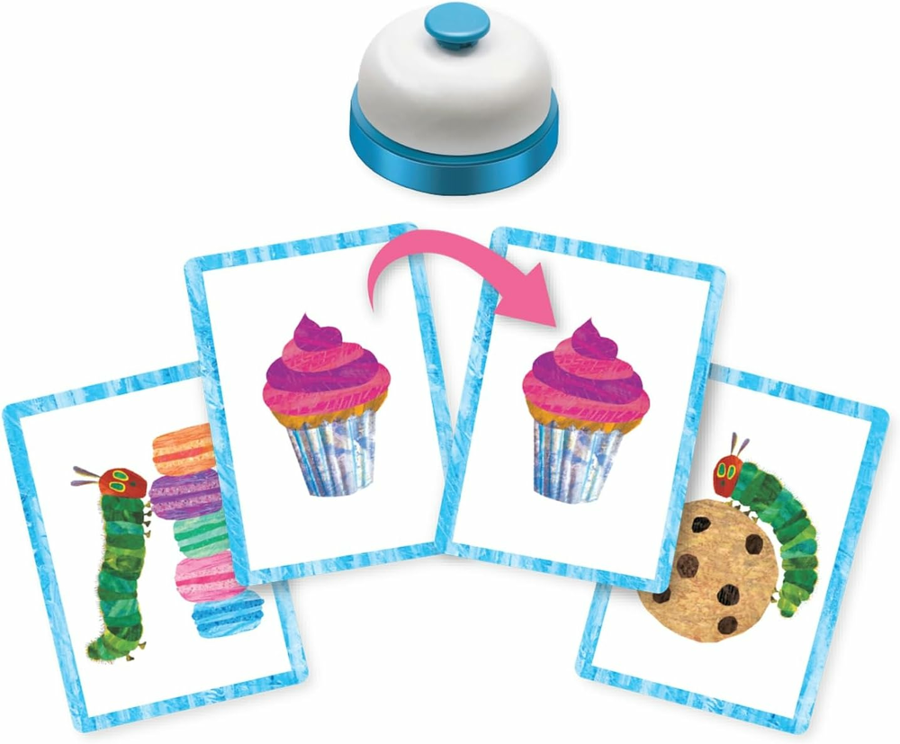Inspired by Eric Carle's beloved classic, this game brings the joy of baking to a playful environment where young children can develop their memory and matching skills. Players take turns flipping colourful Bake Shop cards, racing to ring the bell when they find a match. Each match includes the number of baked goods on the card, adding a layered learning aspect to the game for a parent/guardian and child. The game is perfect for 2 to 4 players, making it an ideal activity for family game nights or classroom play. The simple setup and easy-to-follow rules ensure that even the youngest players can jump in and start having fun. With Very Hungry Caterpillar Bake Shop, children enjoy a delightful play experience and strengthen critical cognitive and social skills in a creative and hands-on way.