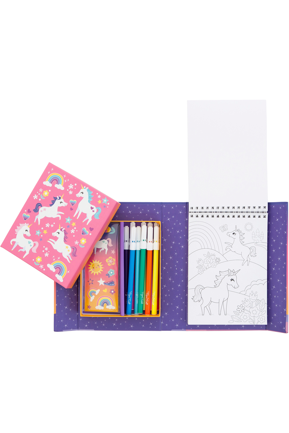 The Tiger Tribe Colouring Set: Unicorn Magic is jam packed with colouring in activities, markers and stickers. Its compact and portable design is perfect for kids on the go for no-mess fun. Explore, colour and decorate unicorn-lovers' favourite things in delicate detail for hours of fun and relaxation. The creative activity set has been specially designed with storage compartments to keep stationery and artwork safe, making it perfect for portable, no-mess and no-fuss play.