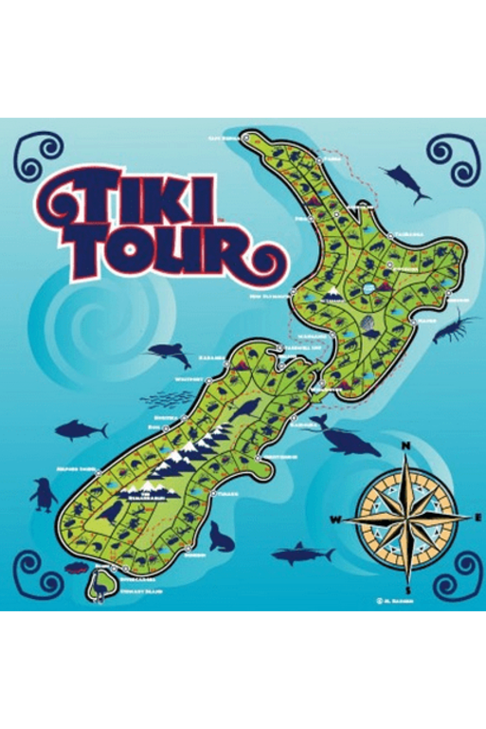 Hey! lets go for a Tiki Tour! This is a common expression in NZ meaning to go on a journey or to explore somewhere new. This game will take you on a race around NZ until you reach the Remarkables in Queenstown. Along the way you will meet some of NZ's unusual wildlife... Where will you end up! Come and find out! Let's go for a Tiki Tour! It is like Snakes and Ladders but faster and better. Along the way you will meet some of New Zealand's wildlife. Throw the dice and see what you land on - Pukekos can take you forward or backwards, Katipo spiders make you miss a go, kiwis put you up with the game leader and volcanoes take you right back to the start. The player who circumnavigates both islands of NZ and makes it up to the Remarkables first, wins.