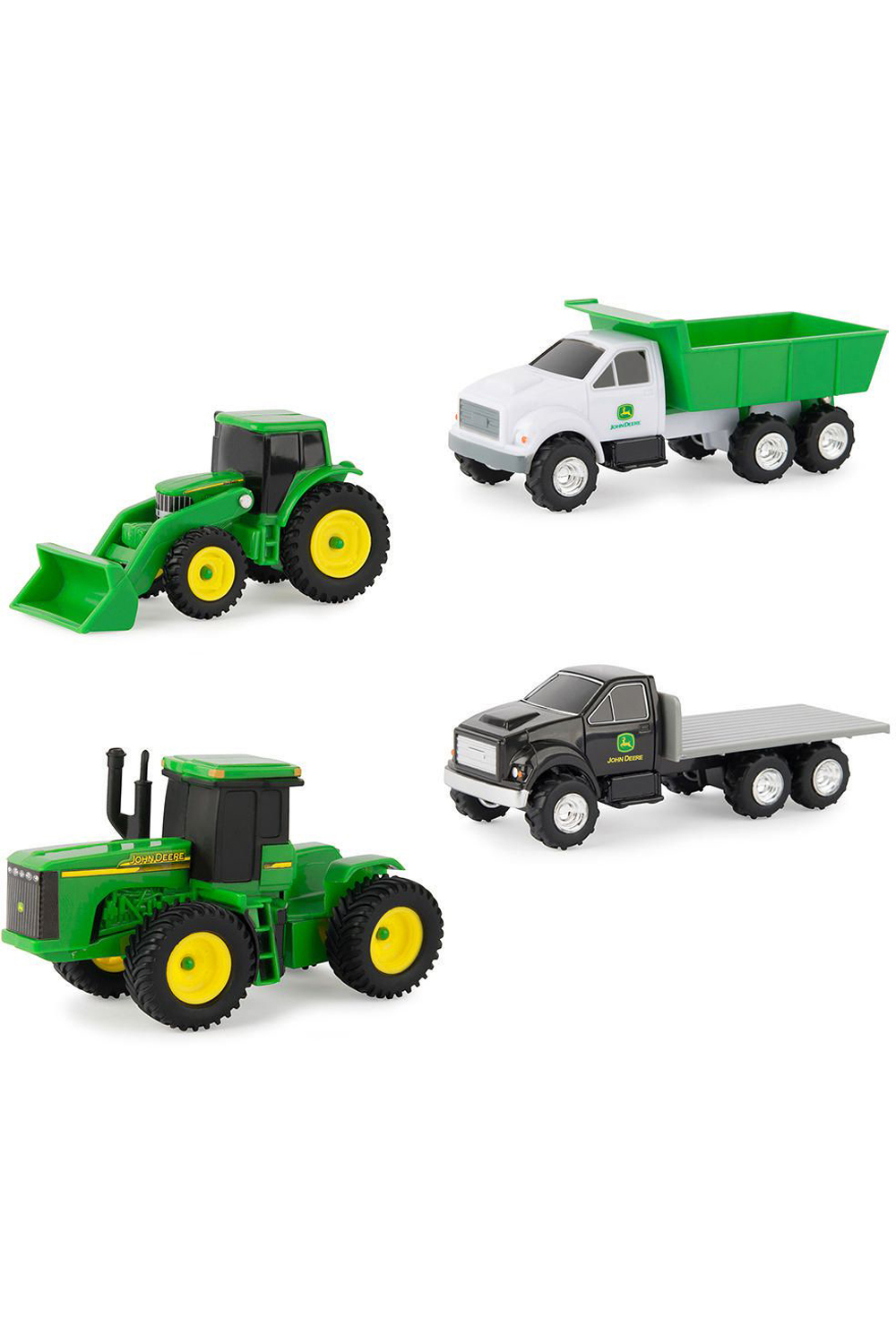 This four pack of John Deere vehicles includes a 4-Wheel Drive Tractor, Tractor with Loader, Dump Truck and a Flatbed Truck. All feature John Deere deco, moving parts and a die cast chassis. Great item for gift giving and great play value.