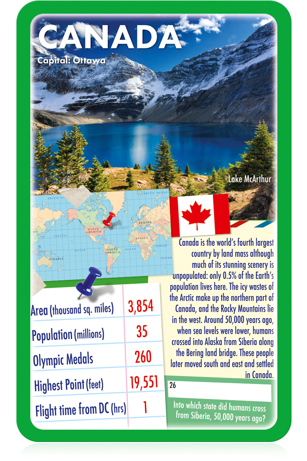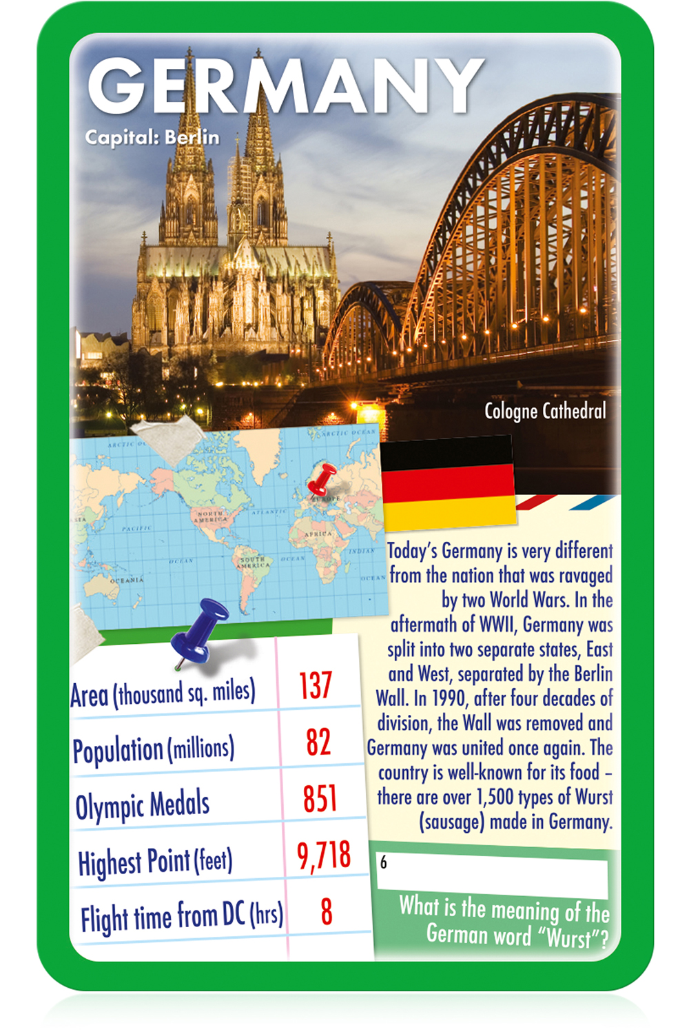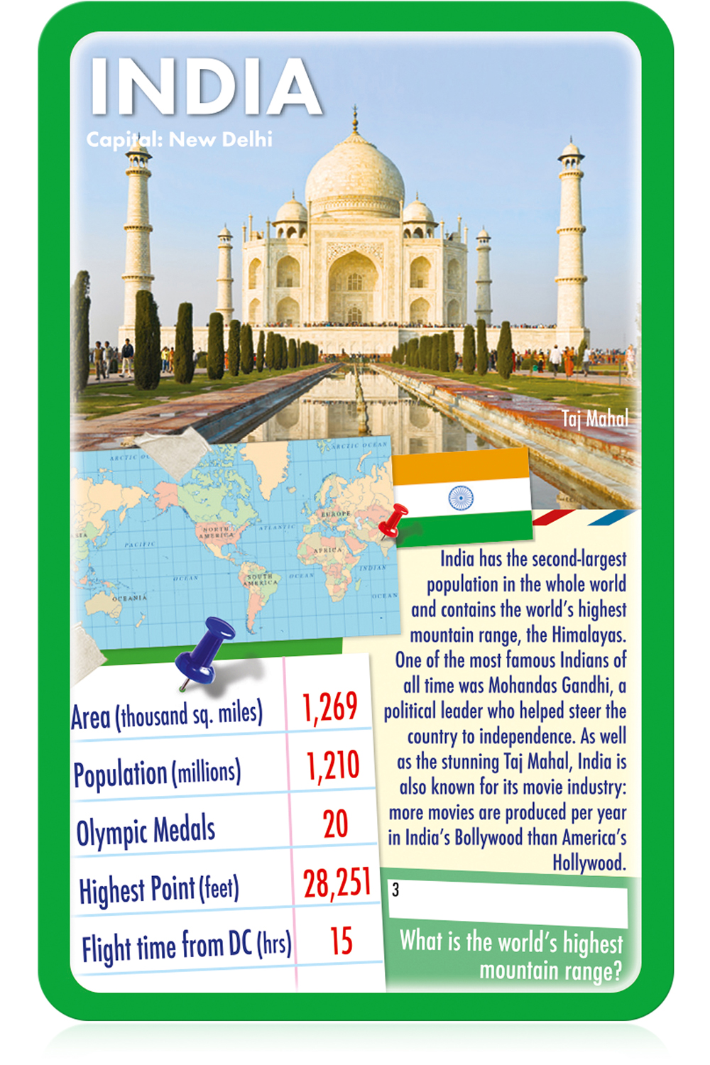 What do you know about the countries of the world in this playground classic Top Trumps game? Play Top Trumps anytime, anywhere, with as many people as you like. Each card in the deck contains a list of numerical data, and the aim of the game is to compare these values to your opponents and try to 'trump' them. If the value you have chosen on your card is better than your opponents, you win their card. Play continues until one player runs out of cards. The player who obtains the entire pack of cards is the winner.
