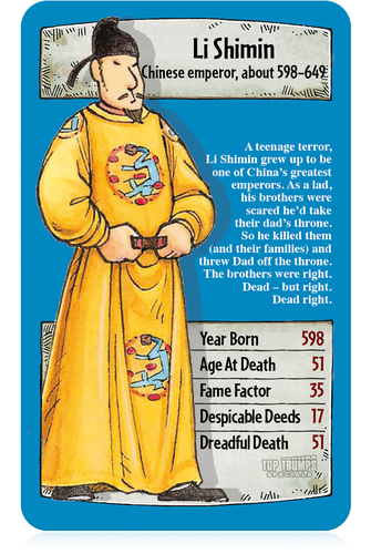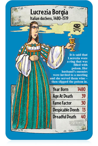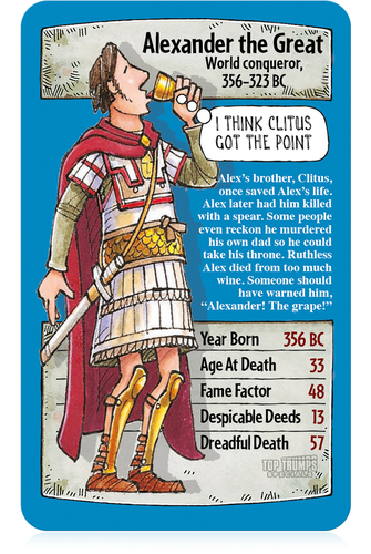 The classic playground past time of Top Trumps is back with this Horrible Histories themed set! Each card in the deck contains a list of numerical data, and the aim of the game is to compare these values to your opponents and try to 'trump' them. If the value you have chosen on your card is better than your opponents, you win their card. Play continues until one player runs out of cards. The player who obtains the entire pack of cards is the winner.