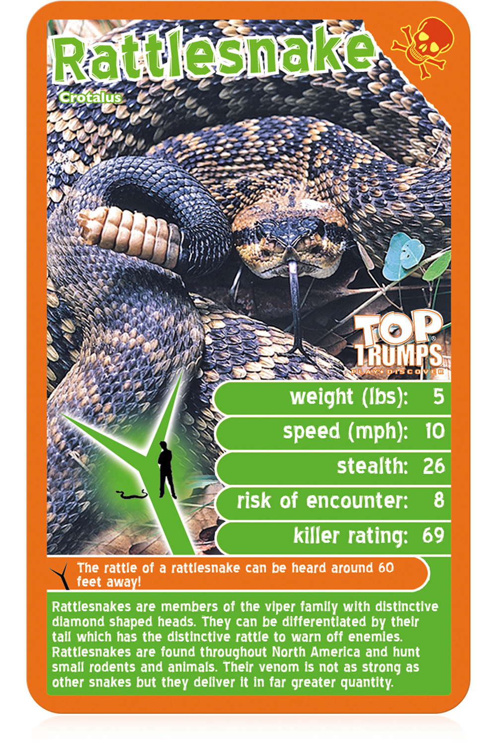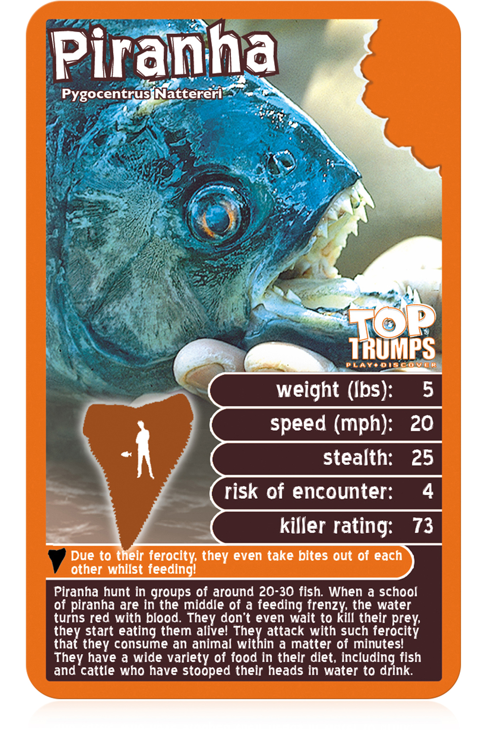 The classic playground past time of Top Trumps is back with this Predators themed set! Each card in the deck contains a list of numerical data, and the aim of the game is to compare these values to your opponents and try to 'trump' them. If the value you have chosen on your card is better than your opponents, you win their card. Play continues until one player runs out of cards. The player who obtains the entire pack of cards is the winner.