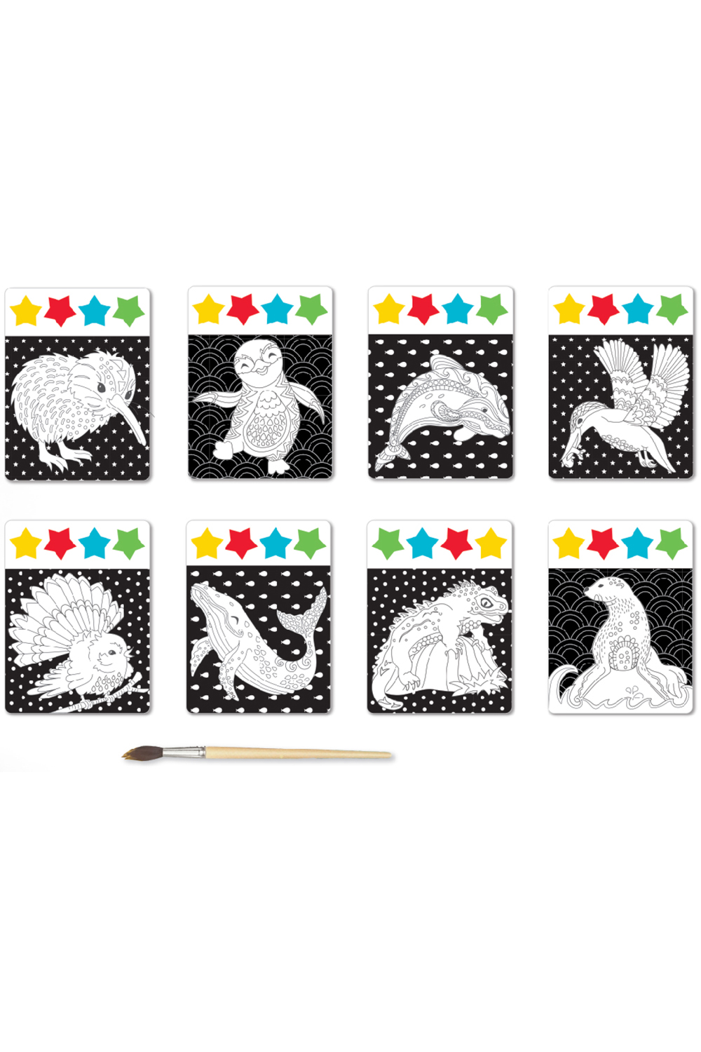 - Contents: 8 Unique animal designs: baby kiwi, penguin, whale, humming bird, fantail, whale, tuatara, fur seal; Paintbrush