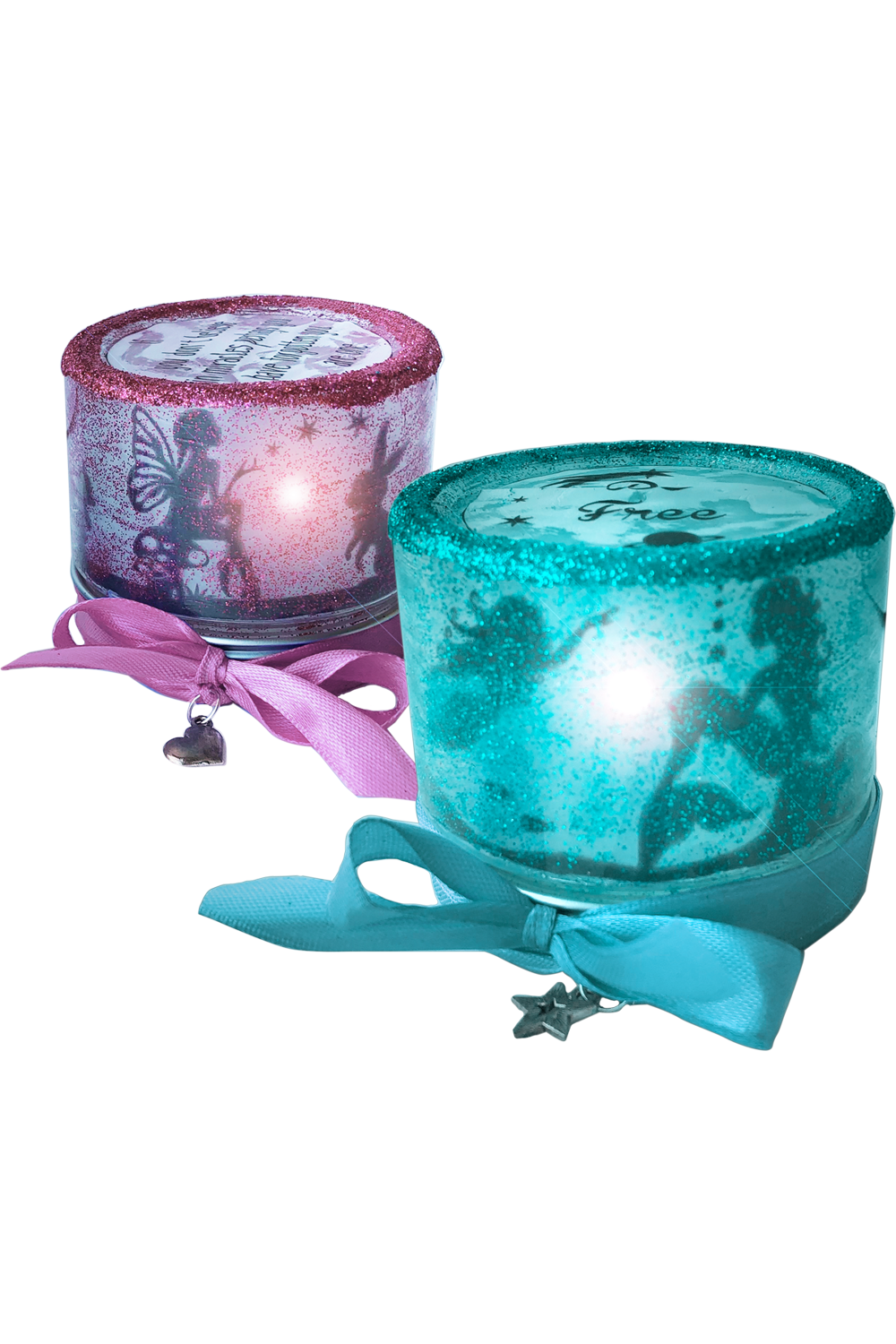 - Contents: 2 tubes of glitter, 2 flameless candles, 2 plastic jars, stickers, twilight design box, ribbons