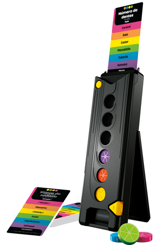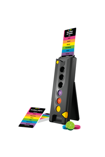In the Drop Trivia party game, players have all the answers - they just need to drop them in order! This fast-action, electronic trivia game plays in as little as 15 minutes. Play head-to-head with 2 players or in teams. In each round, start by dropping a trivia card with 6 answers into the game tower. Then each side takes turns trying to guess the correct order of the answers to score points. For example, rank 6 debut albums from least to most recent. Players place their guesses by dropping pucks into the tower, and they earn points for answers in the right spots. For a game show-like experience, the tower guides players through the game with voice commands and sound effects. After 4 rounds, the team with the most points wins! Looking for fun games for game nights or board games for adults? This game is a crowd-pleasing choice, and it's a great gift for teens and adults who love trivia board games.