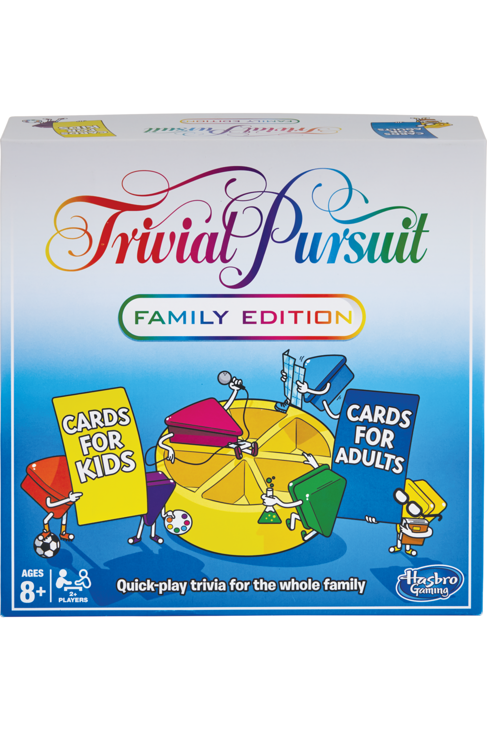 In this great edition of Trivial Pursuit everyone in the family gets to show off their knowledge, and you can be sure that there are plenty of questions to intrigue and entertain whether 10 or 100! With the questions being for both adults and children, it means that the playing field really has become equal, and so everyone stands a chance!You'll find there's fun for all ages with Trivial Pursuit Family Edition. Players - or teams of players - move around the board answering questions and collecting wedges to win the game. There's 2400 questions to tax your brain cells - split between 1200 for adults and 1200 for kids, so there's a question you can answer no matter your age. Suitable for 2-6 players aged 8 and up, this fun family game includes: Gameboard 2400 questions on 400 cards Two card holders Six movers 36 wedges Die Instructions