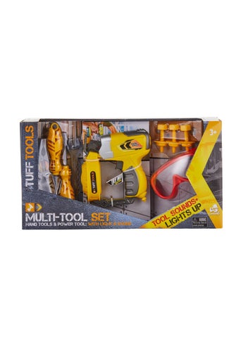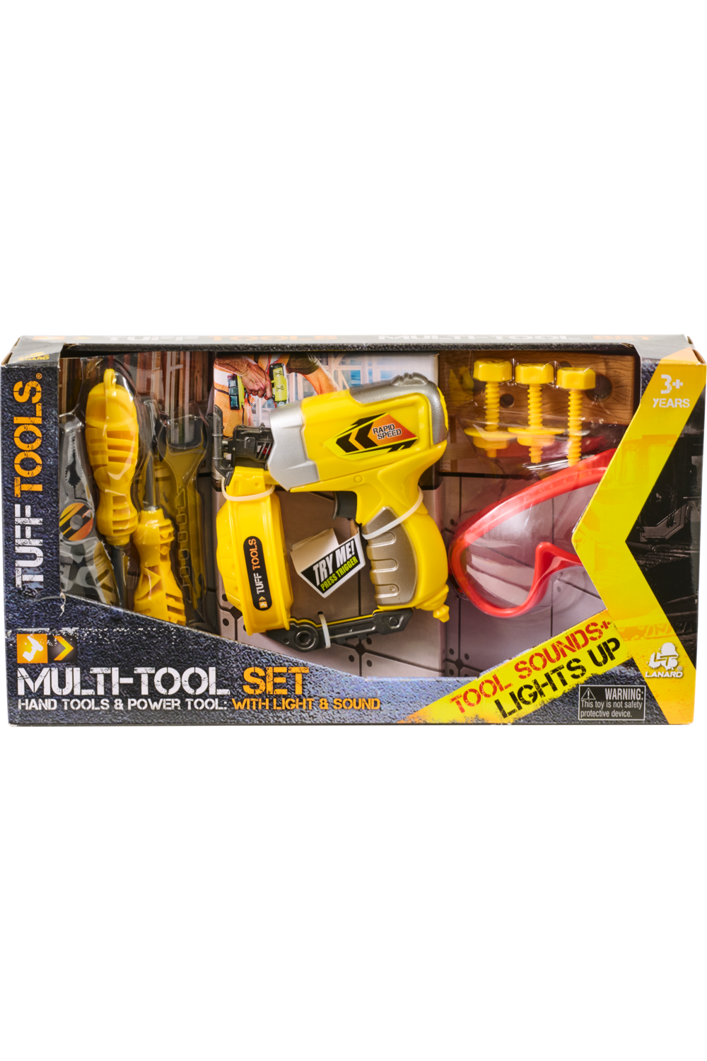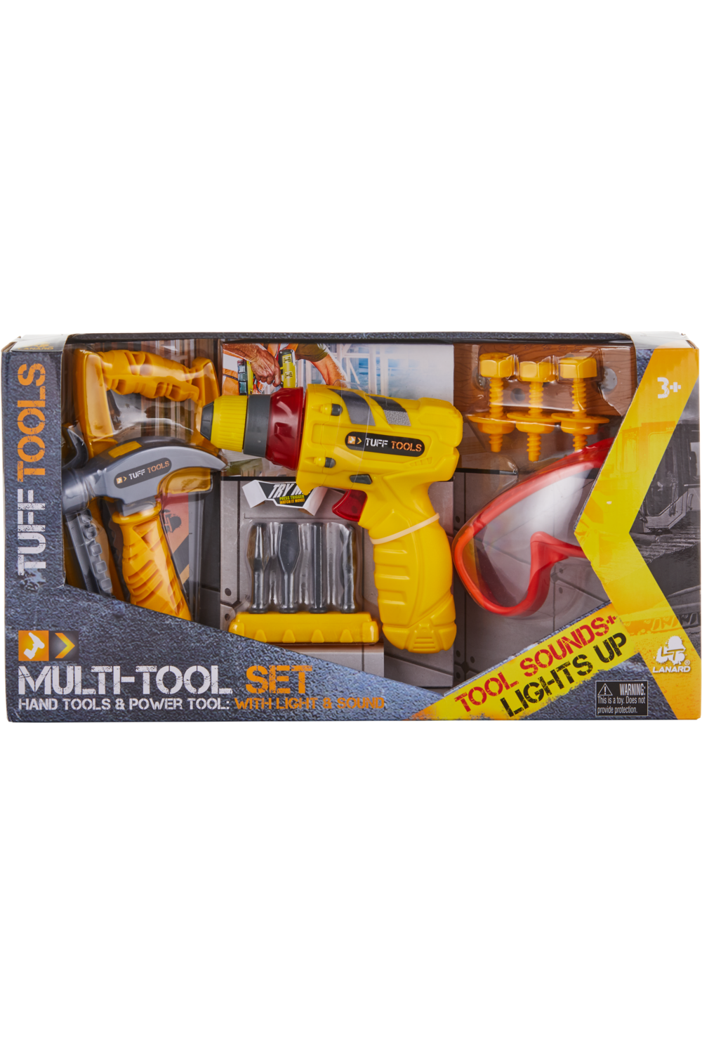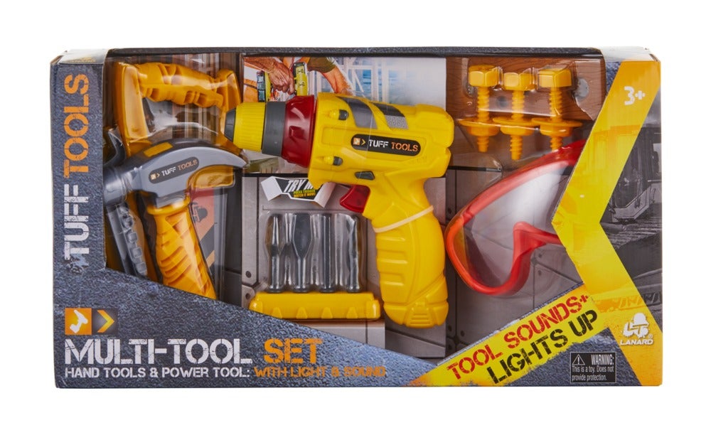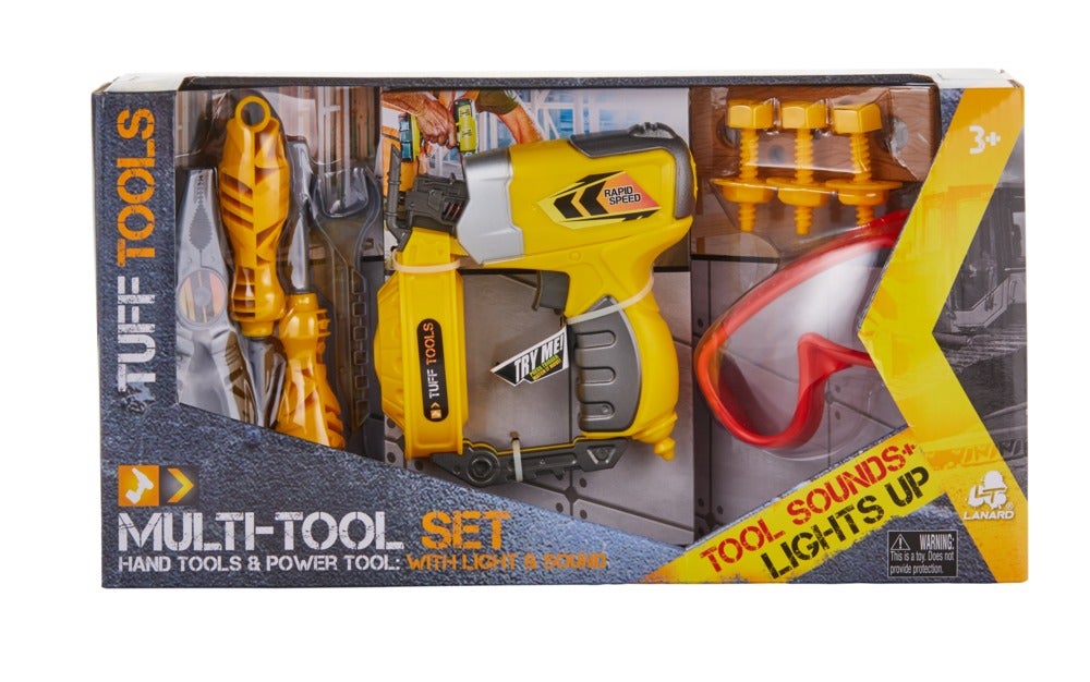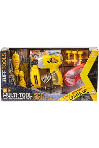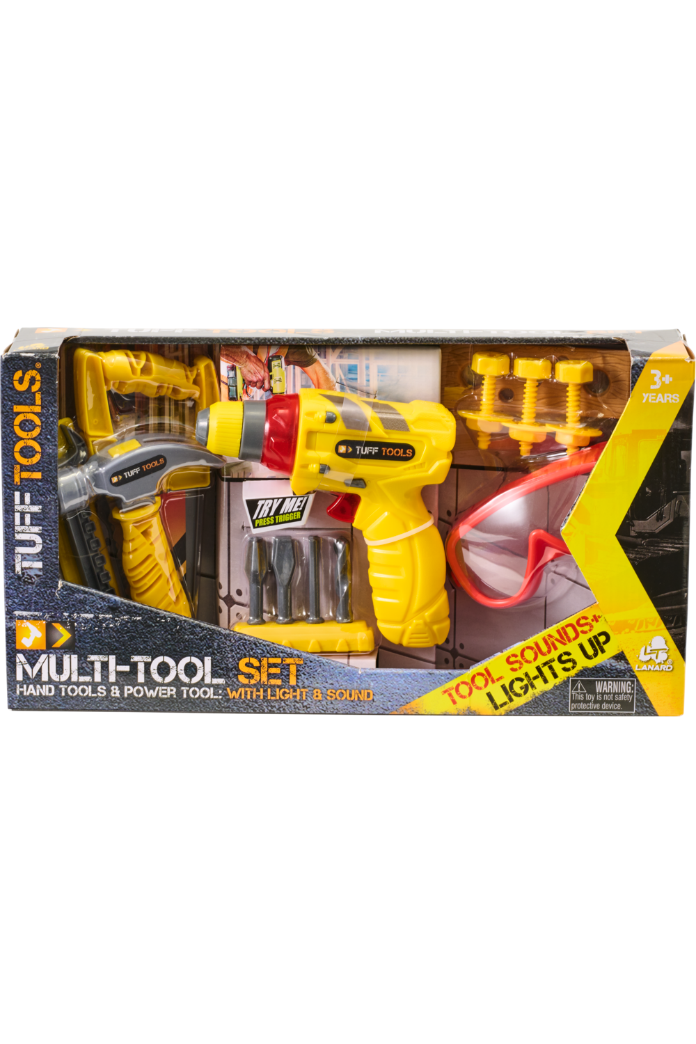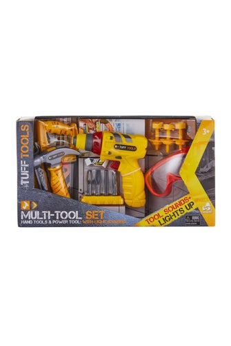 Let your little builder learn about the basics of construction with an awesome set of Tuff Tools toys! Introduce to your young builder a power nailer or a power drill (each sold in separate sets), along with extra accessories necessary for learning about construction! Each set comes with a pair of pretend safety glasses and a pretend power tool, as well as basic accessories. The power tool lights up and makes sound to reflect real construction noises! Collect both sets. Assorted designs available.