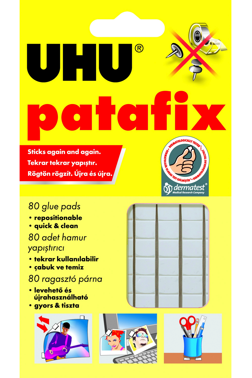 UHU patafix # the clever alternative to pins, tape and thumbtacks! UHU patafix is a removable, reusable adhesive for a quick and clean fixation of small items such as photos, postcards, drawings, posters ... to various surfaces like walls, doors or furniture. 1000's of uses at home, at school or in the office! Both removable and permanent adhering of small objects on wood, cement, glass, metal, plastic and porcelain. Suitable for fixing of posters, decorations, small electronic devices, cables and much more. Not suitable for delicate materials or surfaces. Do not use on recently painted areas and wallpaper. Try on small sample first.