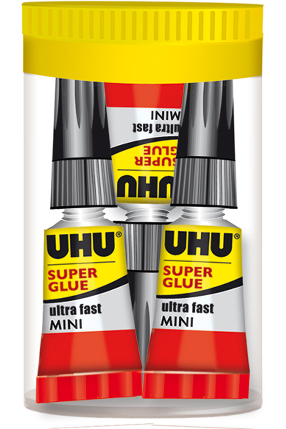 UHU Ultra-fast and extremely strong liquid super glue in 3 single mini tubes. The originally sealed tubes always provide the right dose of perfect, ready-to-use glue quality. Packed in a solid storage box. The liquid adhesive flows into smallest corners and joints. Dishwasher proof and water resistant. Ideal for small-area bonds. Glues almost all solid and flexible materials like many plastics (such as rigid PVC, ABS, PS, Plexiglas, polycarbonate (Makrolon), and phenolic resins (Bakelite)), porcelain, ceramics, leather, metal, wood, cork, felt, cloth (check suitability first), and rubber. Only partly suitable for glass (over a certain period of time the bond becomes brittle, causing it to weaken). Not suitable for PE, PP, silicone resins, PTFE, Styrofoam, fabrics and leather clothing. Wipe off excess glue immediately with a dry cloth. After curing, glue residue is very difficult to remove. Points of Attention: Contains cyanoacrylate. Bonds skin and eyelids together in seconds. If product comes into contact with the eyes, rinse immediately with plenty of water and seek medical advice. In case of contact with skin, glue can be dissolved by soaking in warm soapy water. Then apply a skin cream. May cause respiratory irritation. Avoid breathing vapours. Keep out of the reach of children.