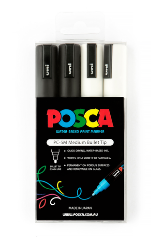 A pack of two black and two white markers from the Uni Posca PC-5M range. The PC-5M markers has a 2.5 mm bullet shaped fiber-tip. POSCA is a paint marker popular with artists and creative hobbyists. Perfect for craft, architects, children and surfers. An essential tool for creation and self-expression, it is used by amateurs and professionals every day on all types of surfaces.