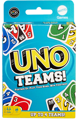 UNO Teams is a new way to play the classic game! Players still match colour, number and symbol but instead of every-man-for-himself, they team up in pairs of two and play together to win. Special cards and rules help teammates work together, but both players must get rid of all the cards in their hands to win. And remember, when you (or your partner!) are down to your last card, don't forget to yell 'UNO!'