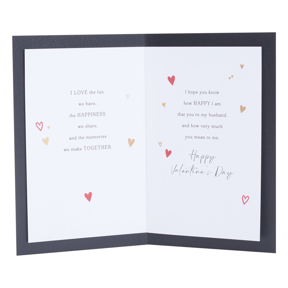 Tell your husband how much you love being his wife with this romantic Valentine's Day card, featuring a heartfelt message and a gold foil hearts design, printed on premium quality board. Message reads: Husband, you & me... always. On Valentine's Day, I want you to know that I love being your wife and sharing life with you... I love the fun we have, the happiness we share, and the memories we make together. I hope you know how happy I am that you're my husband, and how very much you mean to me. Happy Valentine's Day