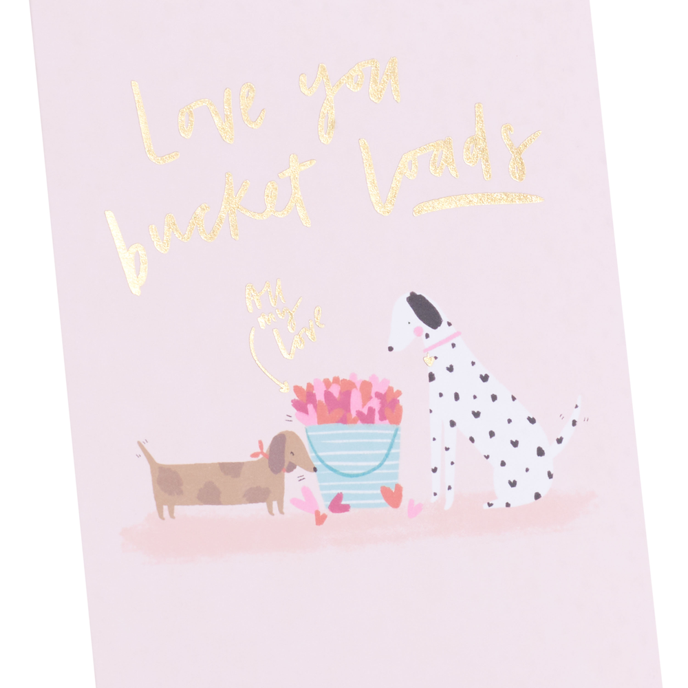 Tell them you love them bucket loads with this cute Valentine's Day card, featuring adorable dog characters and gold foil lettering. Message reads: Love you bucket loads. Happy Valentine's Day!