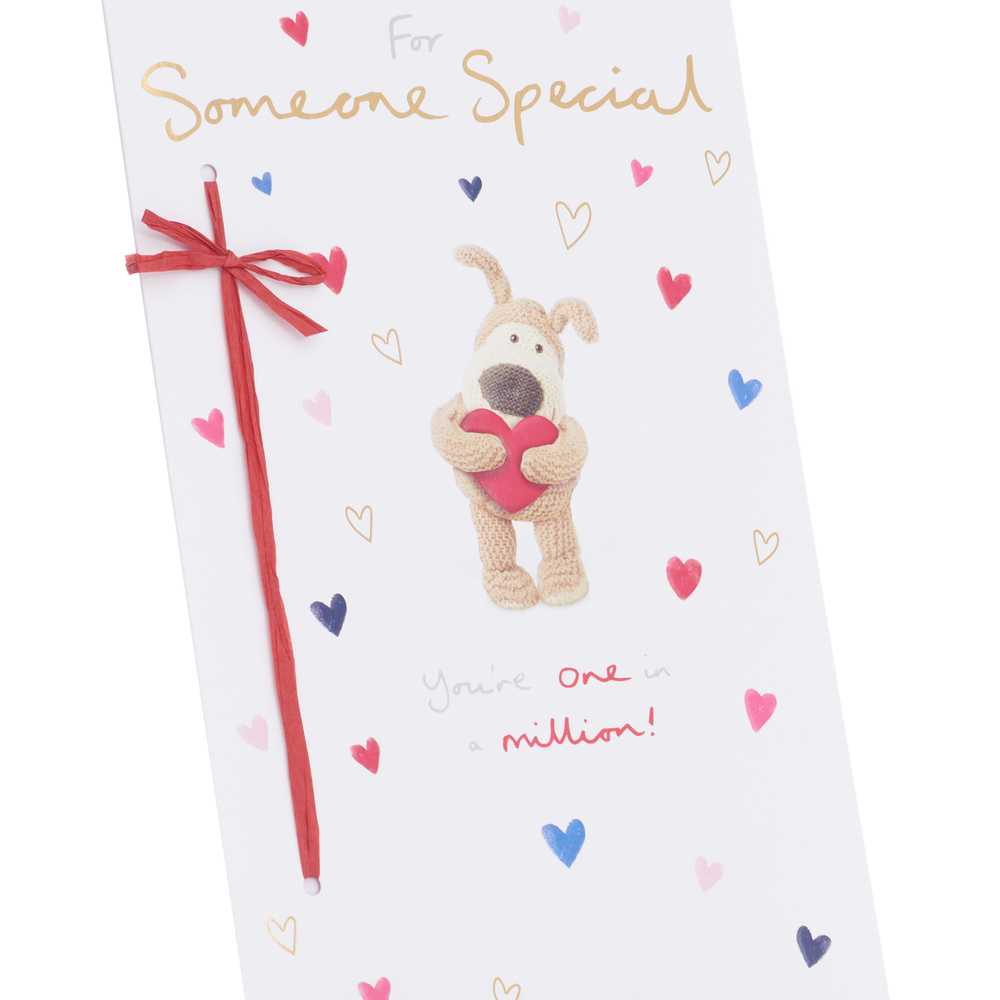 Tell someone special they're one in a million with this cute Boofle Valentine's Day card. It features the adorable dog holding a heart, printed on premium quality board with gold foil details and a red raffia ribbon. Message reads: For Someone Special. You're one in a million! Wishing you a very happy Valentine's Day! With lots and lots of love