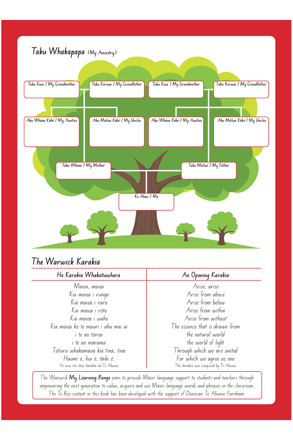The Warwick My Topic Book 3 exercise book features a soft cover, 32 leaves (64 pages) and pages that are plain on one side and 9mm ruled on the other. This exercise book contains Te Reo Maori focused reference material that dives deeper into Maori culture and language and begins to take the step into a more immersive approach all while making this step supportive to students and teachers alike.