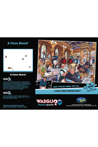 Wasgij Mystery 27: 'A Close Shave!' is the title of this fantastically funny Wasgij 1000-piece puzzle. Just a trim? Short back and sides? Our Turkish Barber is doing a roaring trade. How about a straight blade and hot towel shave, or a smooth finish with a fiery flourish? Scissors and razors hover over gullets, quiffs and mullets, but will loved ones approve of their partners' new look? Is a naked flame the best accessory for a trim, or is it becoming too hot to handle? Use your imagination, and the clues provided on the box, to piece together what will happen next. This is the scene you will have to puzzle.- Not suitable for children under 3 years
