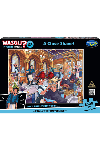 Wasgij Mystery 27: 'A Close Shave!' is the title of this fantastically funny Wasgij 1000-piece puzzle. Just a trim? Short back and sides? Our Turkish Barber is doing a roaring trade. How about a straight blade and hot towel shave, or a smooth finish with a fiery flourish? Scissors and razors hover over gullets, quiffs and mullets, but will loved ones approve of their partners' new look? Is a naked flame the best accessory for a trim, or is it becoming too hot to handle? Use your imagination, and the clues provided on the box, to piece together what will happen next. This is the scene you will have to puzzle.