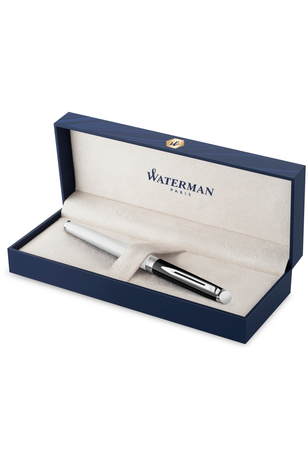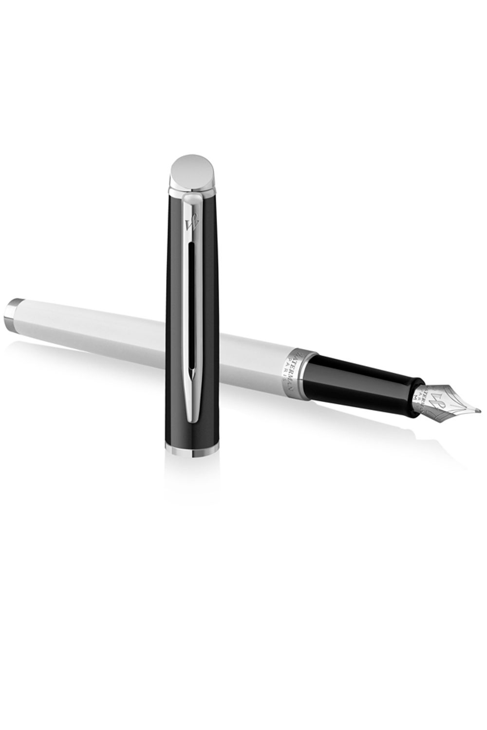 Inspired by this season's bold colour-blocking style, the Hemisphere Fountain Pen in Black & White is a statement ballpoint pen with a stylish finish and slim silhouette. Make a statement with the Hemisphere Colour Blocking collection. Taking its inspiration from this season's boldest trend, this fashion-forward ballpoint pen is stylishly finished with black lacquer on the cap and white lacquer on the barrel. Its striking appeal is set off with the classic Waterman, signature double branched clip and stunning Palladium coated trim. An engraved, stainless-steel nib eloquently showcases the iconic looped Waterman 'W'.