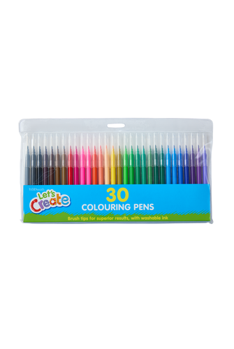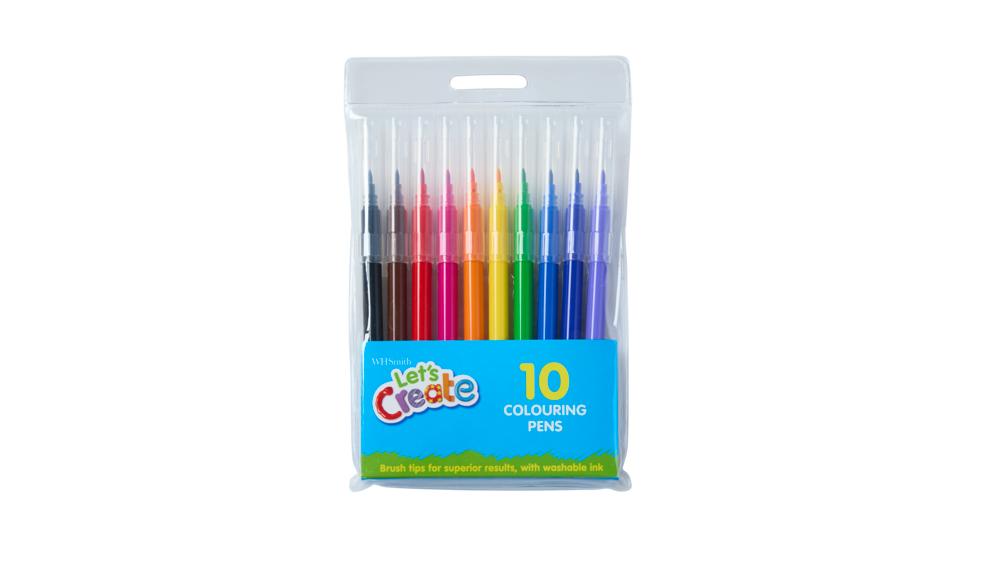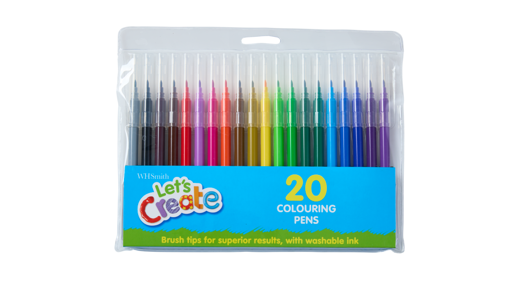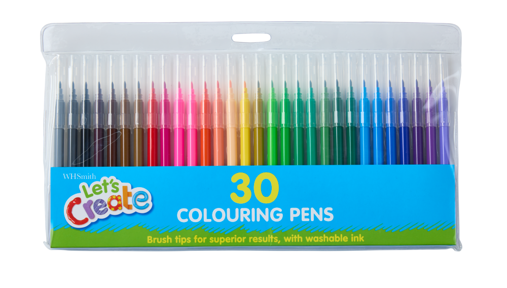 A pack of 30 WHSmith Washable Classic Colouring Pens in bright, bold colours. This pack is great for letting kids get creative. They come in a selection of bright, bold colours, with washable ink, and also come in a handy plastic wallet.