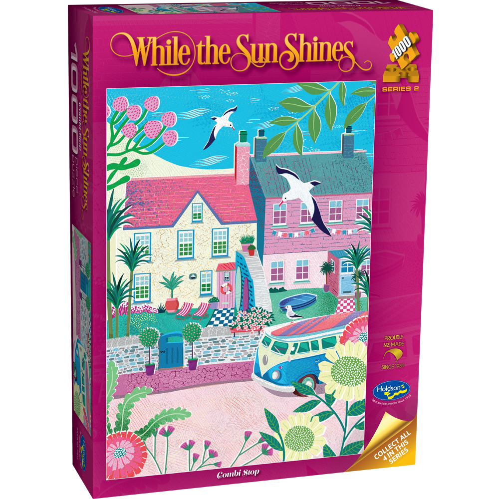 Take a breezy trip to the seaside with Holdson While the Sun Shines - Combi Stop, a vibrant puzzle illustrated by Jo Parry. Bursting with pastel colours and coastal charm, this cheerful scene captures a classic camper van parked outside sun - warmed cottages, seagulls soaring overhead, and flowers in full bloom - pure summer bliss. Part of While the Sun Shines Series 2, this puzzle hums with laid - back nostalgia and the easy rhythm of long, carefree days by the coast.