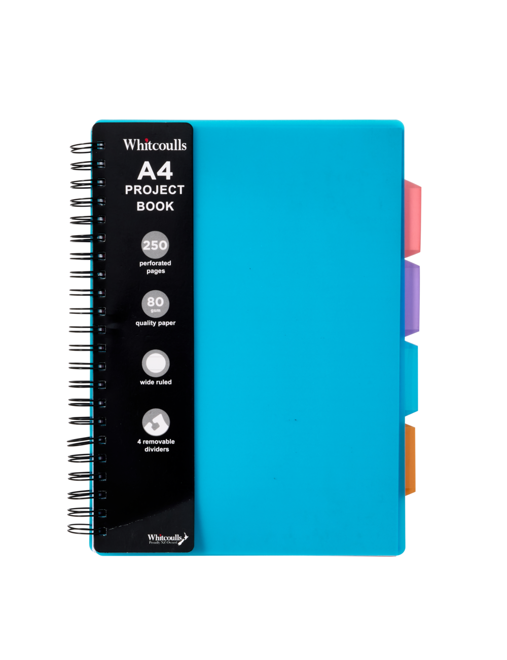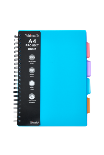 Perfect for keeping your projects and notes organised, the Whitcoulls A4 Project Book makes keeping everything together in one notebook a breeze. This blue cover notebook has 160, wide-ruled, perforated, 70gsm pages. It also features an elastic closure band and five removable coloured dividers.