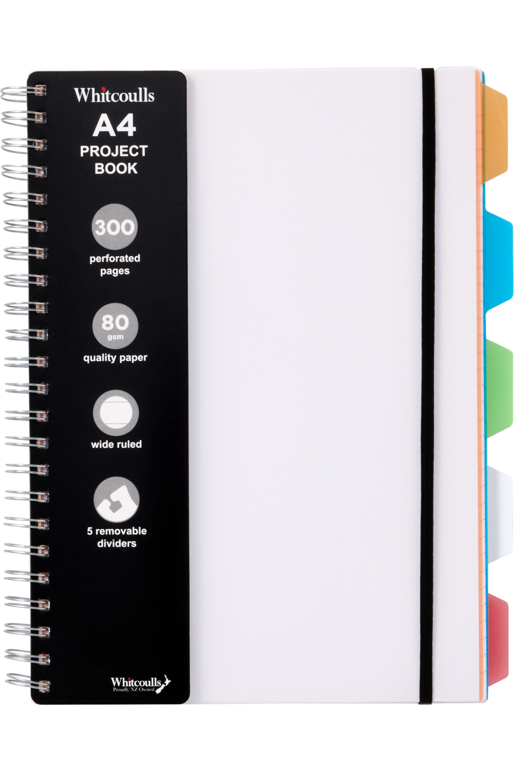 Perfect for keeping your projects and notes organised, the Whitcoulls A4 Project Book makes keeping everything together in one notebook a breeze. This clear cover notebook has 300, wide-ruled, perforated, 80gsm pages. It also features an elastic closure band and five removable coloured dividers.