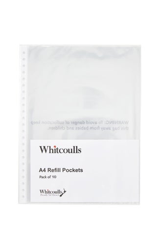 A pack of 10 A4 Whitcoulls clear refill pockets for a refillable display book. Fits up to A4 size sheets. Each pocket fits up to A4 size documents and the durable plastic cover is easy to clean.- Size: A4