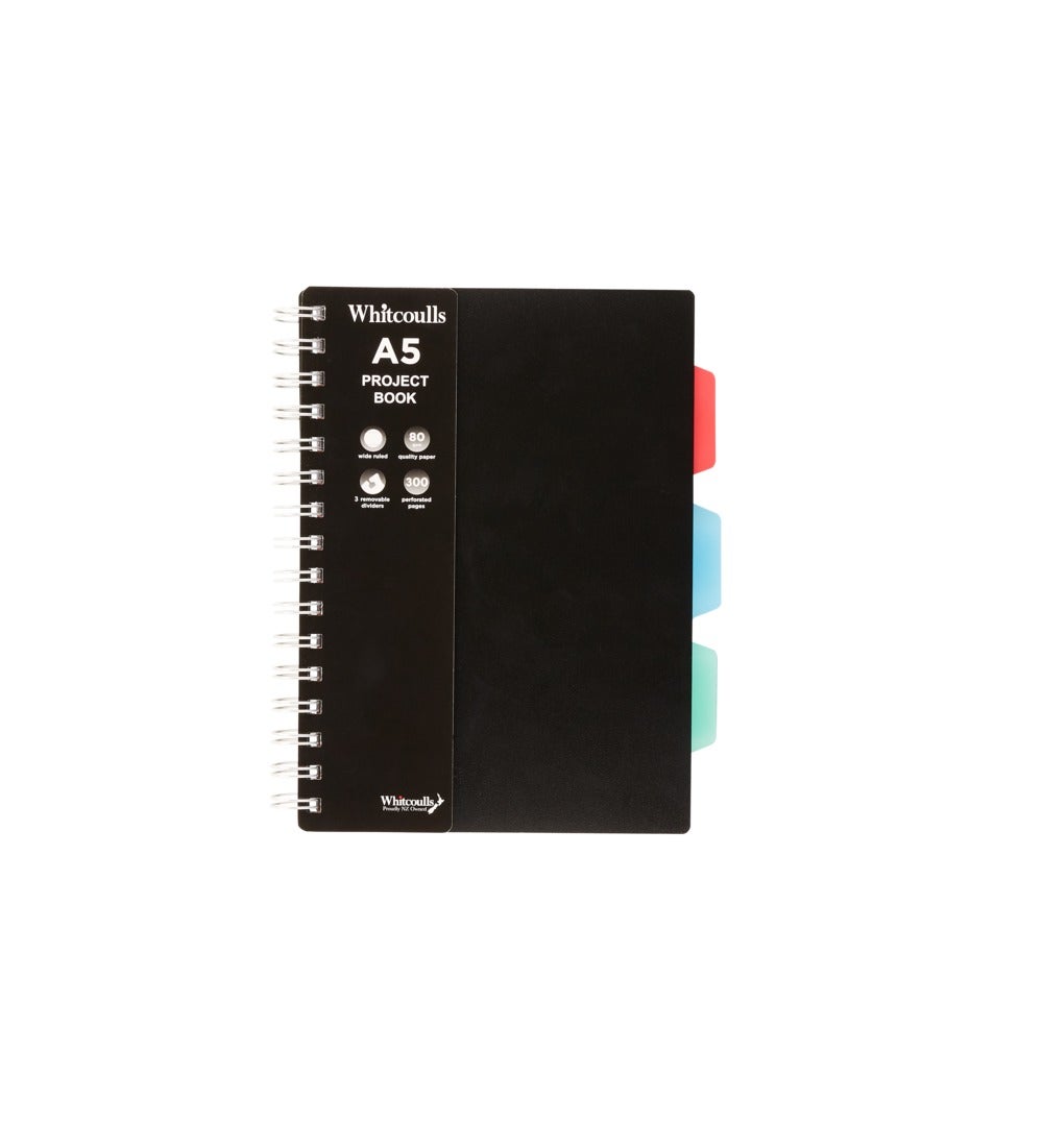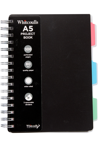 Perfect for keeping your projects and notes organised, the Whitcoulls A5 Project Book makes keeping everything together in one notebook a breeze. This black notebook has 300, wide-ruled, perforated, 80gsm pages. It also features three removable coloured dividers.