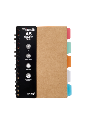 Perfect for keeping your projects and notes organised, the Whitcoulls A5 Project Book makes keeping everything together in one notebook a breeze. This kraft notebook has 160, wide-ruled, 70gsm pages. It also features five removable coloured dividers.