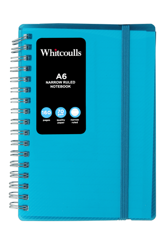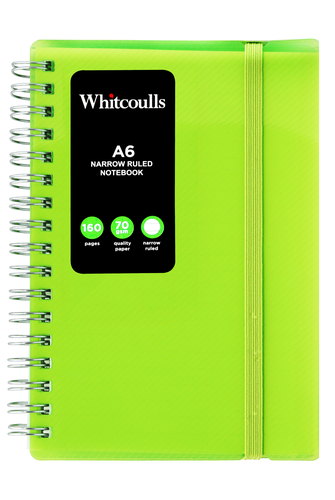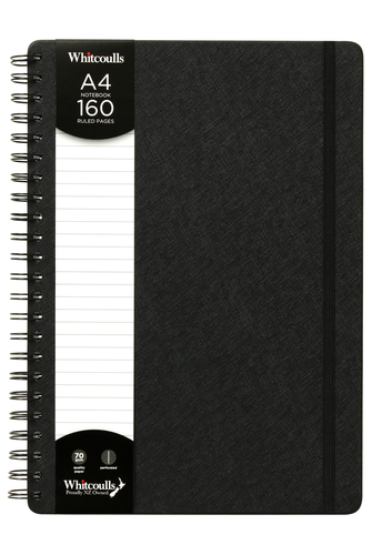 Jot down and keep your notes together with this A5 Whitcoulls branded black notebook. Notebook has 160, wide-ruled, perforated, 80gsm pages. Wiro-binding allows it to lie flat for easy writing and note taking. Includes an elastic closure band.