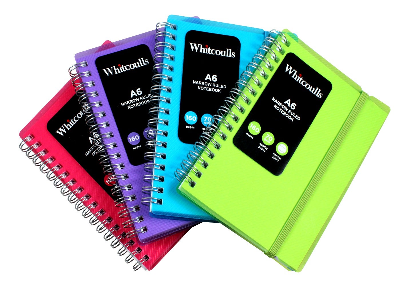 Jot down and keep your notes together with this A6 Whitcoulls branded bright green textured notebook. Notebook has 160, narrow-ruled, 70gsm pages. Wiro-binding allows it to lie flat for easy writing and note taking. Includes a matched coloured elastic closure band.