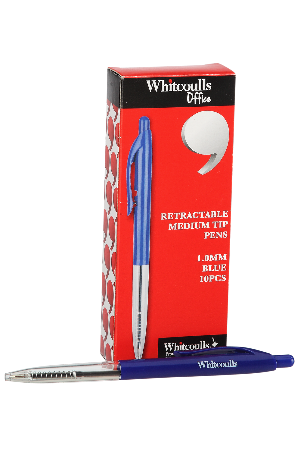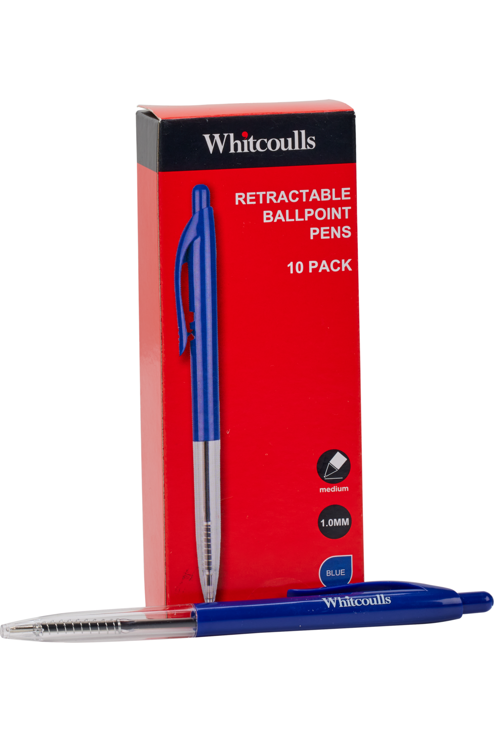 A box of 10 Whitcoulls-branded retractable ballpoint pens in blue. Nib measures 1.0mm for a medium tip and smooth writing experience. Pen barrel and ink come in blue.