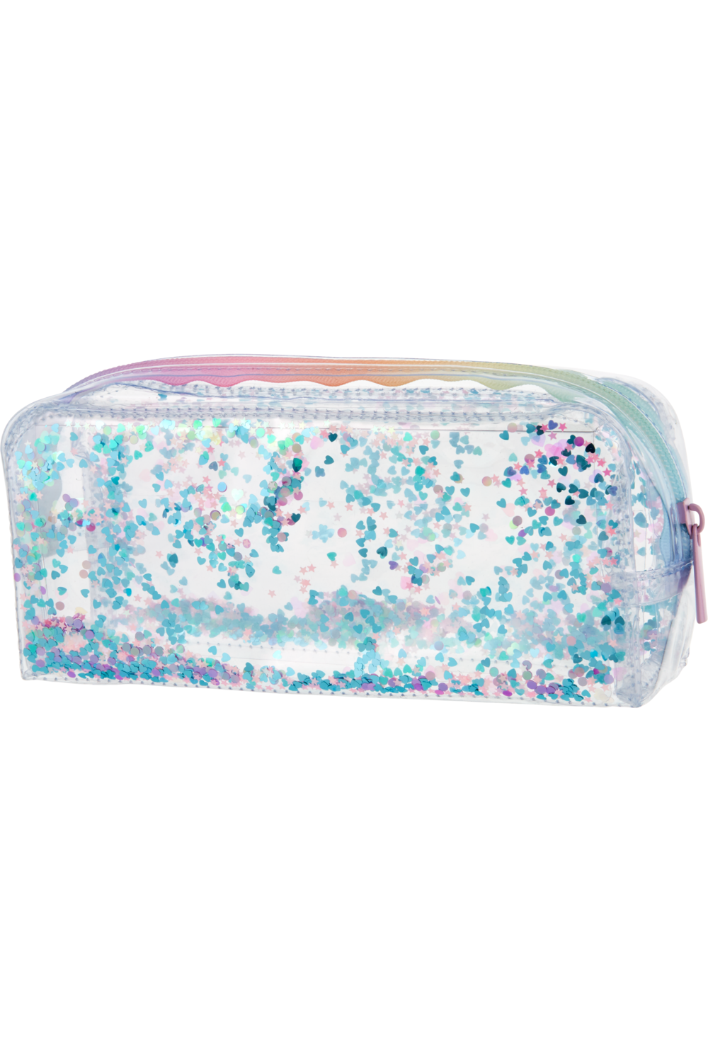 Keep your pens and pencils together with this Whitcoulls pencil case featuring glitter confetti within the double walls of the pencil case. This pencil case features one main zip compartment with a pastel-rainbow coloured zip.