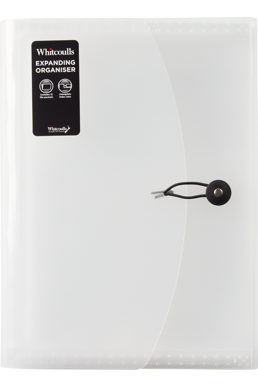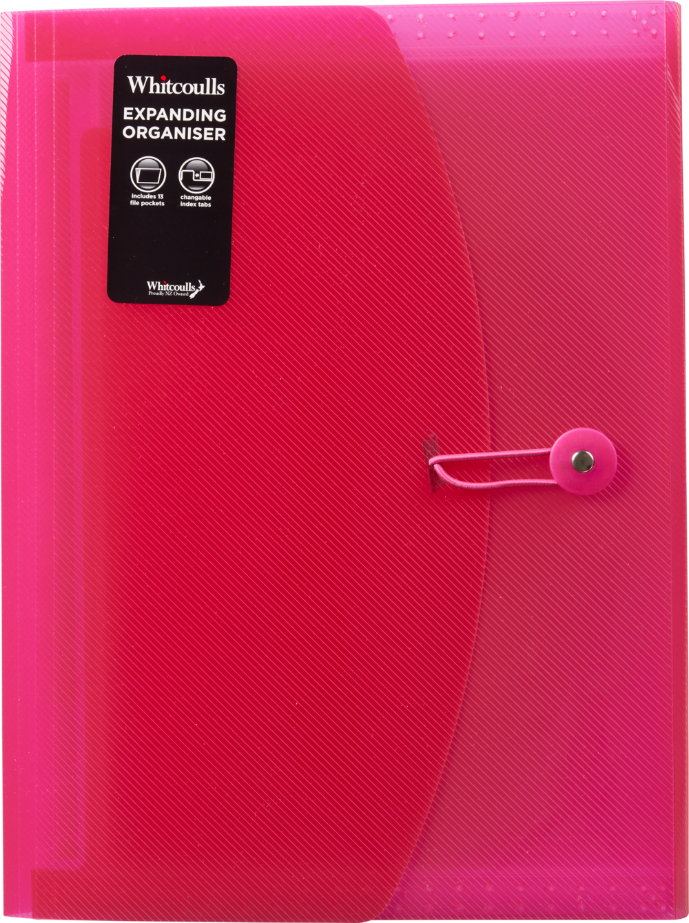 Organise your letters, bills and more with this expanding A4 organiser by Whitcoulls. Sort your documents into the 13 plastic pockets. Features index tabs, an elastic closure loop fastener and a textured plastic exterior. Keep track of what's in each pocket using the changeable index tabs - just slip in a new one to change it. Fits A4 paper. Assorted colours available: pink, teal, blue, purple, yellow, and clear. Please note this is an assorted item, you will receive a randomly selected design/colour for online orders.