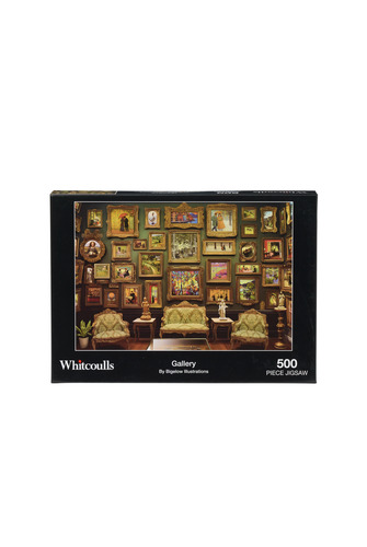 Piece together a wonderful image of a calming art gallery with a wall covered in beautiful pieces of art housed inside ornate golden frames, featuring artwork by Bigelow Illustrations in this Whitcoulls 500 piece jigsaw puzzle. Finished puzzle measures: 49.8cm x 34.3cm.