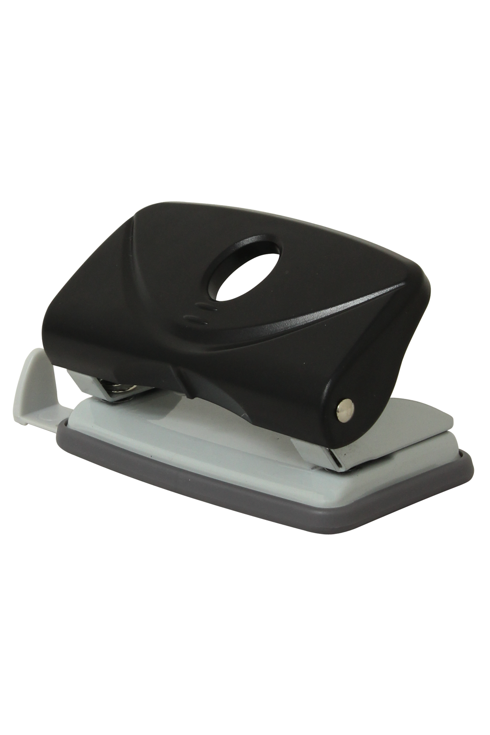 A small, black and grey 2-hole punch from Whitcoulls, capable of punching through 10 sheets of paper at a time. Features a retractable size guide for A6, A5 and A4 paper, as well as a waste tray for the punched paper.