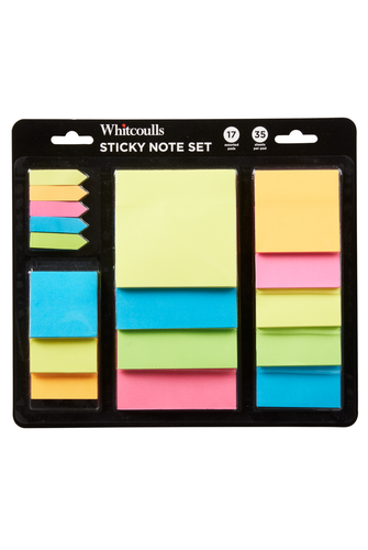 Keep organisation close at hand with this Whitcoulls set of assorted sticky note pads. The set of 17 sticky note pads includes 5 pads of flags, 3 pads of small squares, 5 pads of medium squares, and 4 pads of large square sticky notes, with all pads each containing 35 sheets.