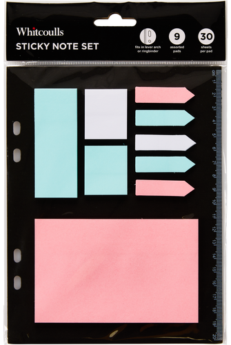 Keep organisation close at hand with this Whitcoulls binder sticky note pad set. The set of nine sticky note pads includes 5 pads of flags, 3 small square pads, 5 medium square pads, and 4 pads of large square sticky notes, with all pads each containing 30 sheets. Sticky note set includes punched holes to fit into binders for organisation and also has 20cm ruler printed on the side of the set.