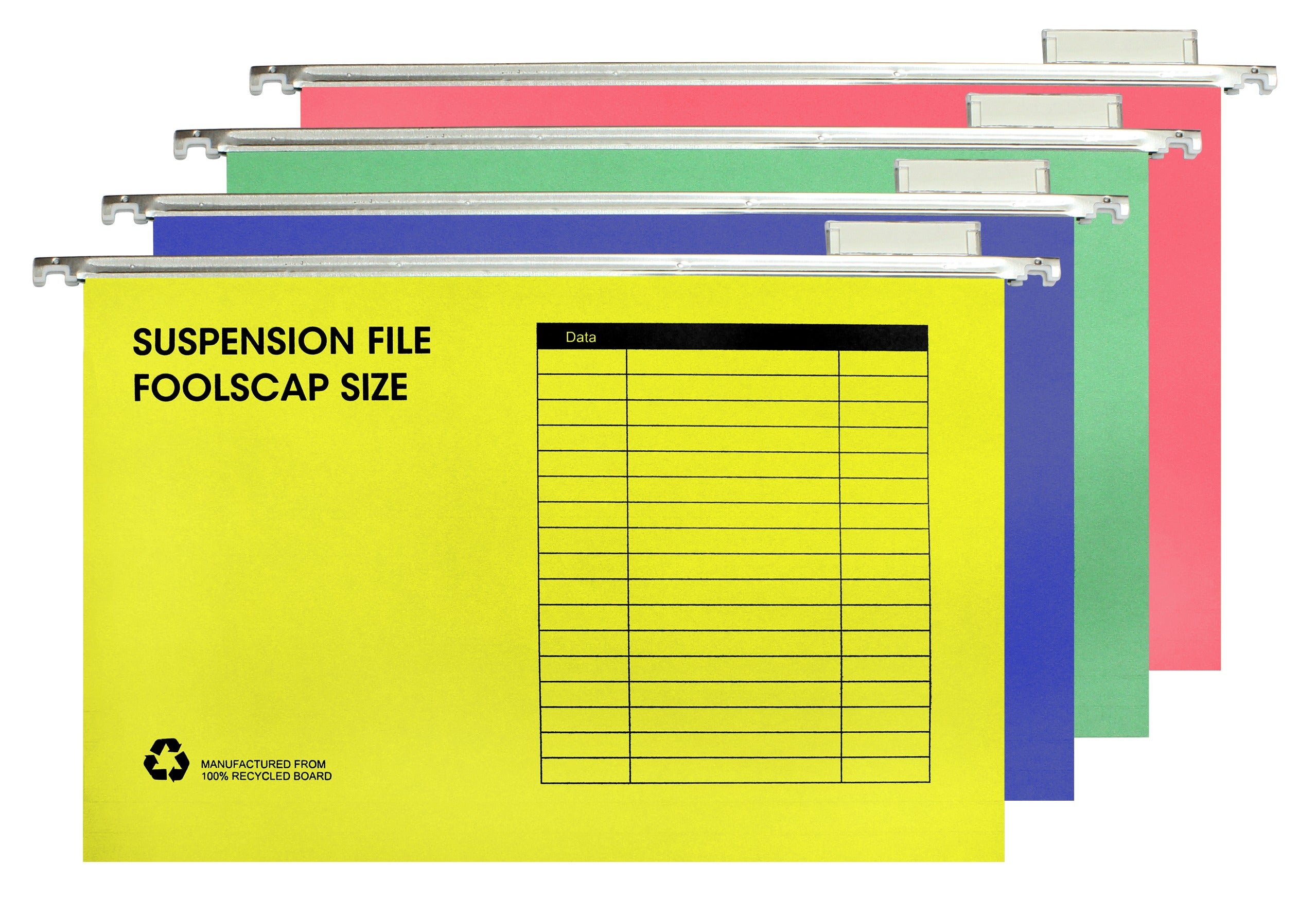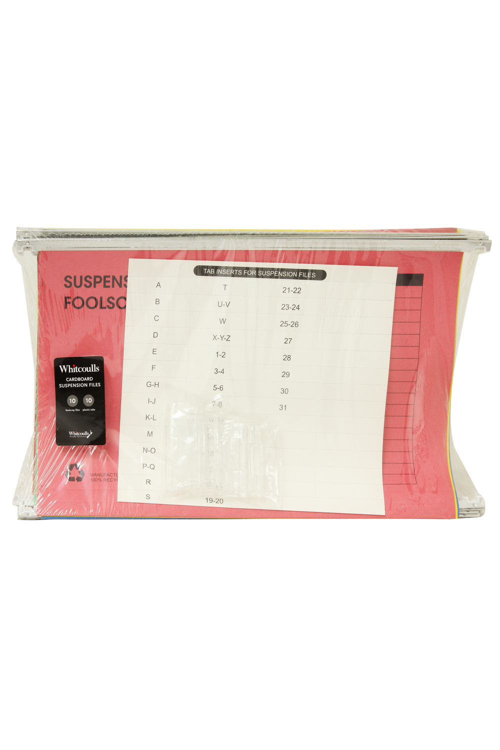 Organise your important documents and more with this Whitcoulls pack of 10 suspension files in foolscap sizing. Each file is equipped with hooks for use in vertical filing cabinets. Each file face has labelling panel for easy file identification. Comes in a variety of colours and is made from 100% recycled board. Pack also includes 10 plastic tabs and inserts for sorting.