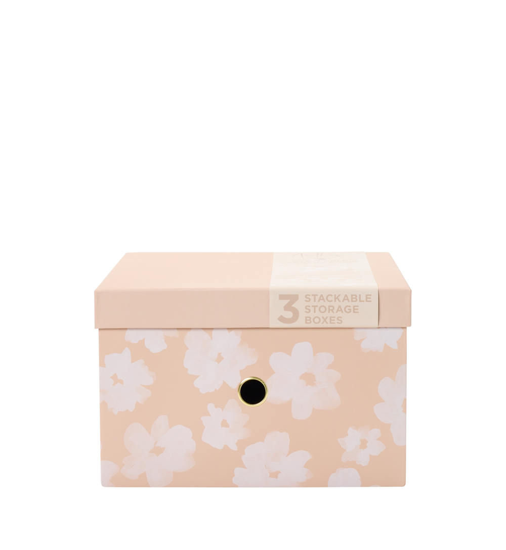Only available in store, not available online. This set of three nested storage boxes from the WHSmith Anthos range is the perfect way to keep yourself and your belongings organised. The smallest box has dimensions of 131 x 131 x 146 mm, the second box has dimensions of 250 x 320 x 163 mm and the largest of the boxes has dimensions of 310 x 378 x 206 mm. The boxes have matching lining and feature metal-edged finger holes to easily pull the boxes out from your shelves.