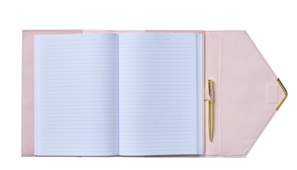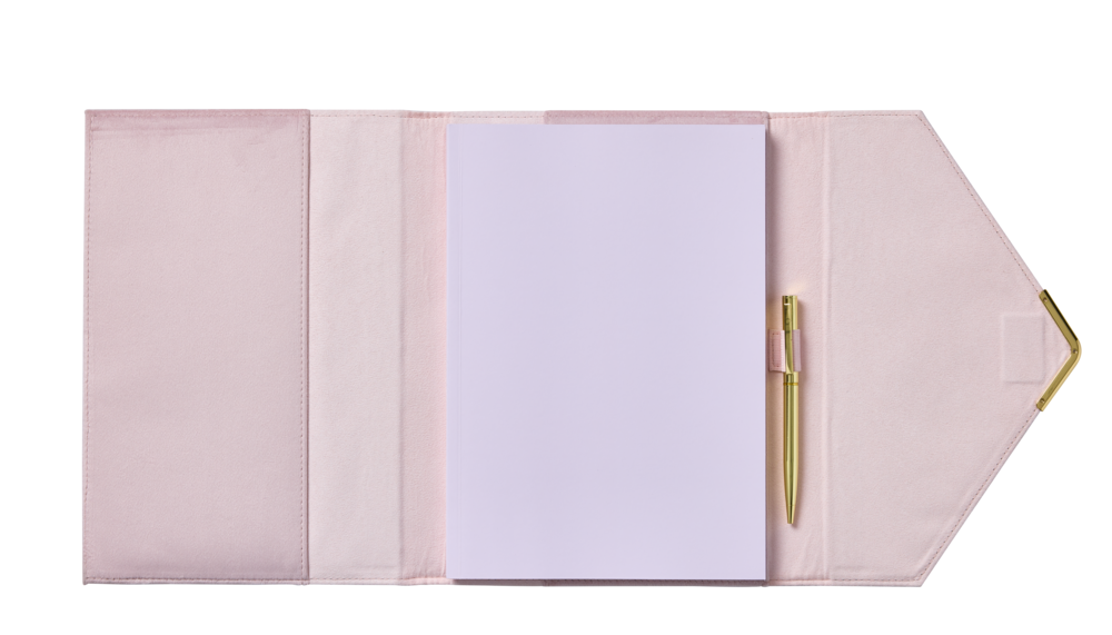 A B5 notebook from the WHSmith Belle range in a gorgeous pink case featuring a gold foil foliage illustration on a magnetic closing flap. The case features a pocket insert for loose papers, a notebook with white ruled pages, and can be replaced to keep using the case in the future.