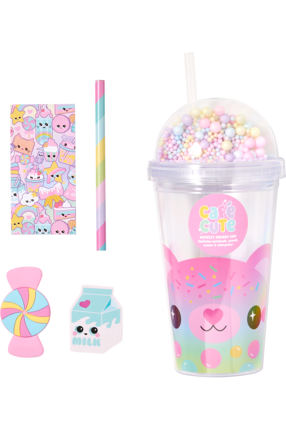 Add some fun to your pencil case with this fashion stationery set from the WHSmith Cafe Cute range stored in an adorable bubble tea cup container. The container holds an assortment of adorable stationery including: a mini notepad, a pencil, a sharpener, and an eraser.