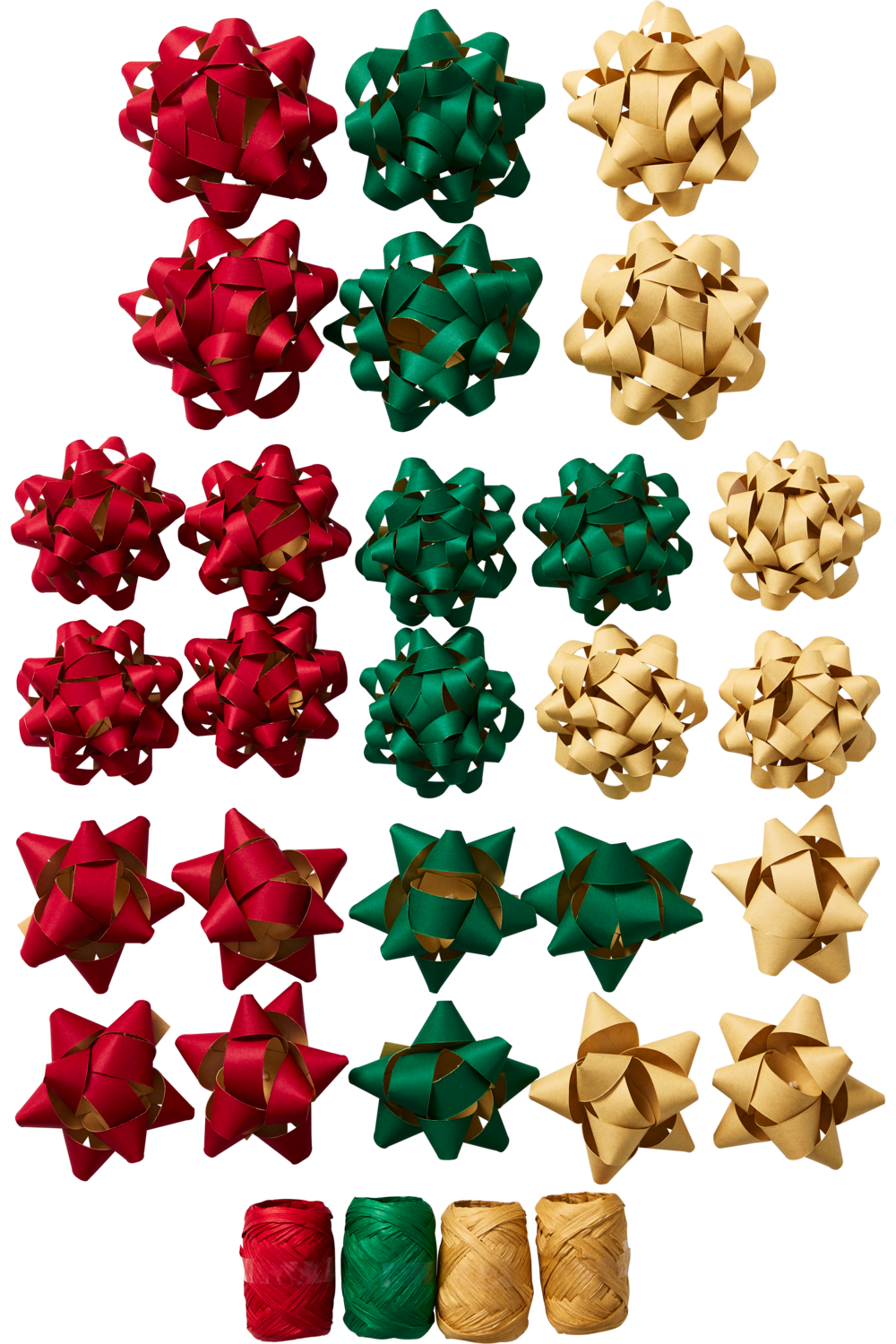 This pack of wrapping accessories will add that special something to your presents this Christmas. Featuring red, green, kraft colours, this pack contains 4 raffia ribbons, 6 large double bows, 10 small double bows, 10 single small bows.