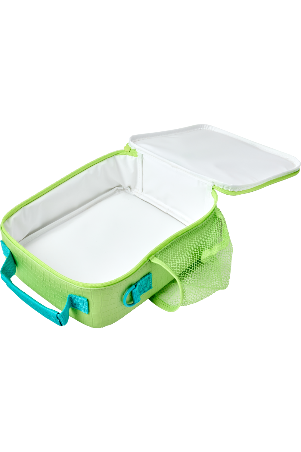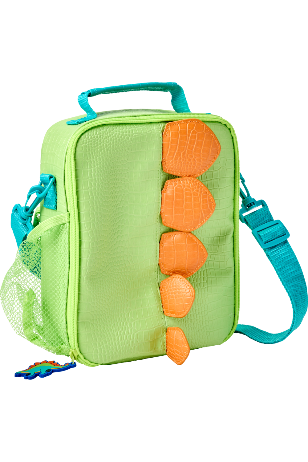 Carry your lunch with you wherever you need to go with this ROAR-some lunch bag from the WHSmith Dinosaur range, featuring orange spikes illustrations on a textured green case. It features a large insulated compartment to keep food cool, an elastic netting to store a drink bottle, a handle, and a strap to carry it around.